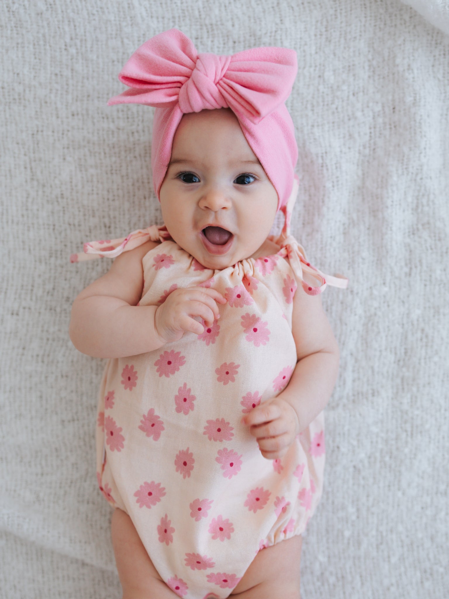 A lightweight linen blend romper featuring our Margot printed design. Functional ties at shoulder and snap buttons at the crotch for easy on/off and nappy changes